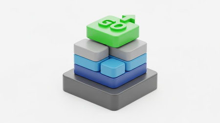 A stack of colorful geometric blocks topped with a green GO symbol and an upward arrow against a white background.