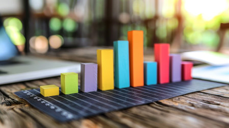 Colorful wooden blocks arranged as bar chart on rustic table