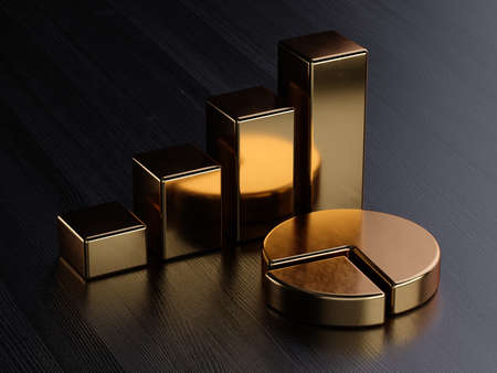 Golden bar graph chart on black wood table background. Business financial concept. 3d rendering illustration