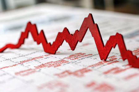 Red arrow is pointing down over financial documents, representing economic downturn