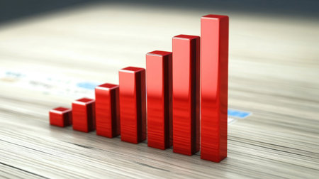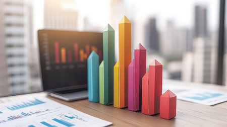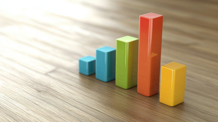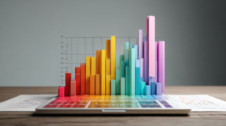 Vibrant 3D bar chart sits on a digital workspace, showcasing data analysis. The image represents growth, trends, and technology in modern business presentations.