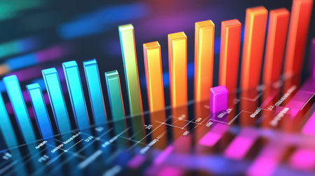 A vibrant D bar graph with colorful bars rising at various heights, displayed on a sleek dark background, showcasing data visualization in a modern business context.