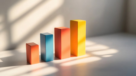 Colorful wooden bars arranged in a playful fashion symbolize growth and success. The warm sunlight casts long shadows, creating a vibrant atmosphere ideal for business and learning themes.