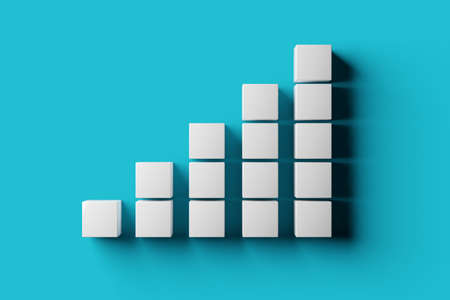 White cube bars forming steps or stairs on blue cyan background, minimal career, success or growth concept, 3D illustration