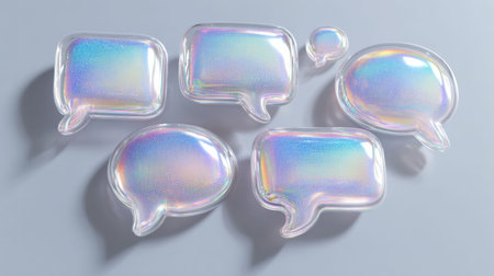A group of speech bubbles floats in space, reflecting light with rainbow colors on a simple grey backdrop, creating a modern design element.