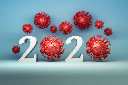 Concept illustration with year 2020 and spiky red virus particles on blue background. 3d illustration.