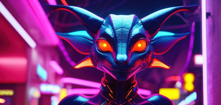 Futuristic alien creature with neon lights in the background. Metallic alien in a cyberpunk city. Concepts of science fiction, extraterrestrial life, high-tech, futuristic design.