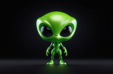 A charming, cartoonish green alien toy with large eyes and a friendly smile, waving its hand. Isolated on a clean white surface.