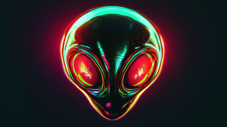 A digitally created representation of an alien head, showcasing large, reflective eyes and a smooth, colorful surface. The artwork uses neon tones to highlight intricate details.