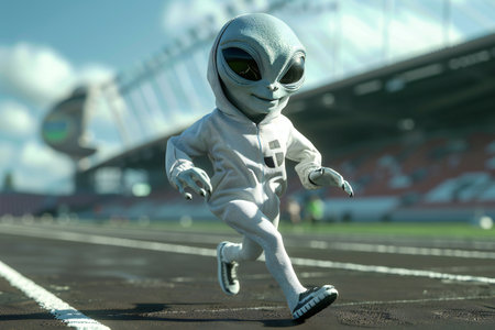 Cute stereo-typical gray alien wearing sporty tracksuit, running on a track, stadium details in the background, 3D render, created by ai
