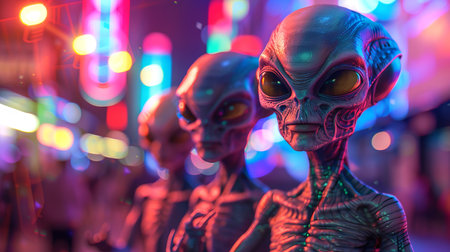 Fictional aliens in a neon-lit city scene. Futuristic extraterrestrial beings. Concept of science fiction, fantasy, alien life, urban landscape.