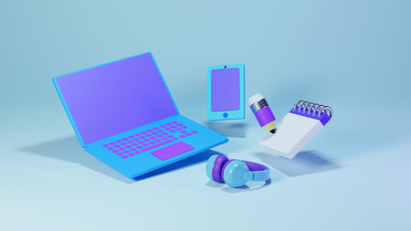 Top view of designer workspace and gear like laptop, tablet, phone and headphones on blue background. 3d rendering of accessories for drawing, sketching and illustrator or photography tools