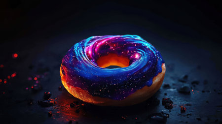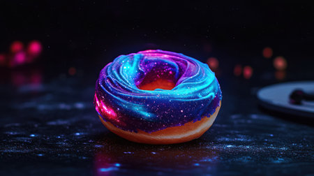 A cosmic galaxy donut with swirling nebula frosting, glowing in dark