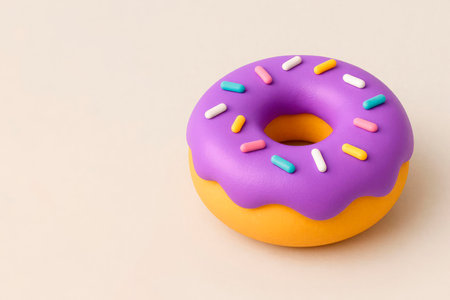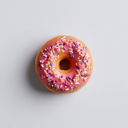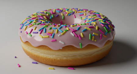 A single donut features pink frosting and colorful sprinkles. The dessert is presented against a seamless, solid-color backdrop. The image utilizes soft lighting, enhancing the texture and color of the treat. Suitable for culinary, advertising, and editorial applications. Focus is on showcasing the object.