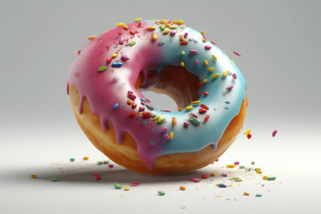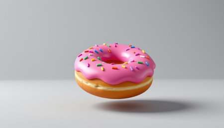 A delicious donut floats gracefully with colorful sprinkles and icing, against a bright minimalist background, capturing the essence of joy and indulgence.