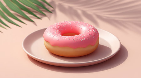 A charming and vibrant pink frosted donut sits on a minimalist plate, beautifully complemented by tropical palm leaves, creating an inviting scene.