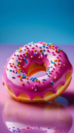 A simple and appetizing image of a donut with a glossy, smooth, pink icing and colorful candies on top, against a monochromatic pink background. The image showcases the texture and color of the donut, creating a sweet and delightful mood.