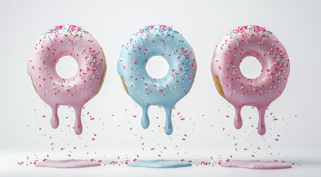 Three colorful donuts with icing and sprinkles appear suspended in mid-air, with icing dripping down to puddles below, against a white background.