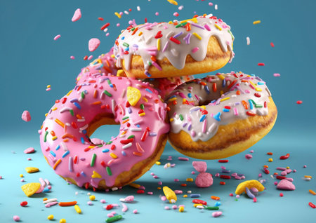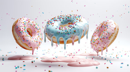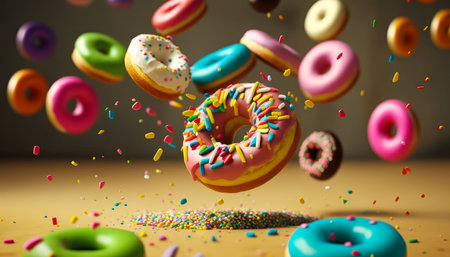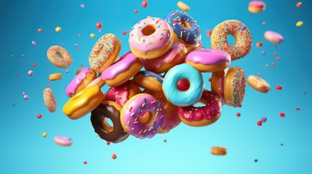 delicious multicolored donuts floating in air, decorated with icing and sprinkles.