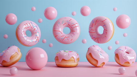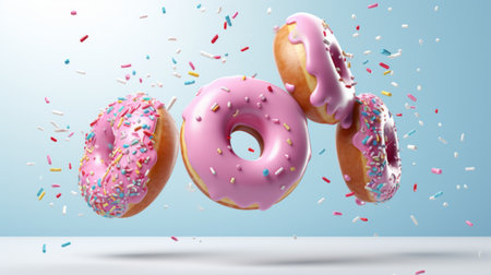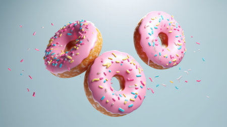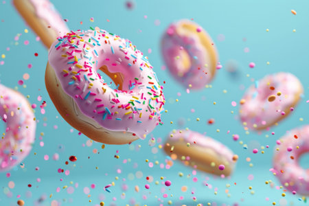 Pink frosted donuts with colorful sprinkles floating in mid-air, set against a pastel blue background, creating a fun and whimsical scene.