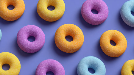 A vibrant arrangement of colorful foam donuts on a rich purple background, ideal for playful designs, party decorations, and creative projects that inspire joy and imagination.