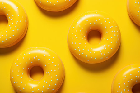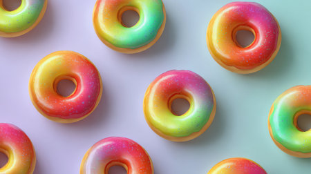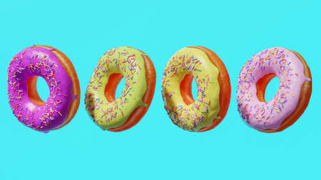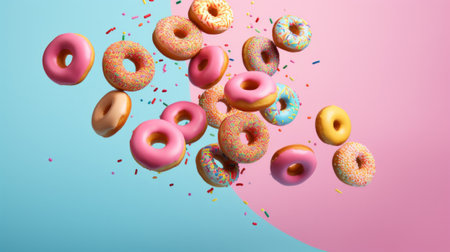 Floating donuts with vibrant toppings, isolated on a pastel background, creating a whimsical and eye-catching food concept.