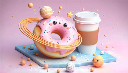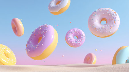 A whimsical scene featuring colorful floating donuts with sprinkles against a pastel sunset desert landscape, inspiring joy and creativity.