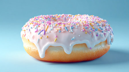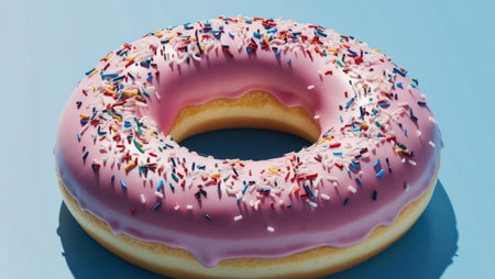 A delightful image of a glazed doughnut, generously coated in pink frosting, adorned with colorful sprinkles. The sweet treat is set against a soft blue background, enhancing its appealing aesthetic.