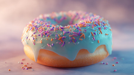 This image features a single donut with a light blue glaze and colorful sprinkles. The image showcases a soft, blurred background and aesthetically pleasing pastel color palette.