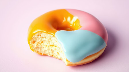Brightly colored donut with a bite taken out, showcasing vibrant icing in orange, pink, and blue on a pastel background