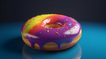 Freshly baked donut topped with generous amount of rainbow-colored sprinkles drizzled with rich sweet icing on colorful background. For culinary book, magazine, food blog, social media platforms