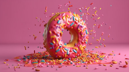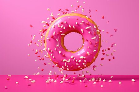Fun pink donut in motion with colorful sprinkles falling and dancing. Generative ai