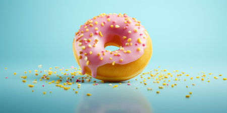 AI Generated. Pink donut with colorful sprinkles on blue background