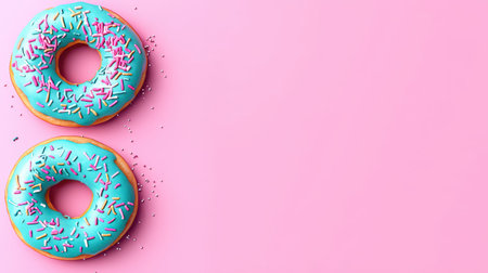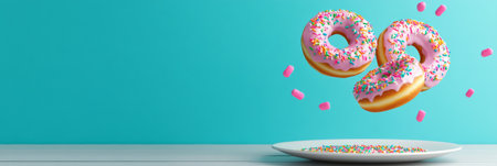 Two delicious pink icing donuts with colorful sprinkles levitating above a white plate with sprinkles on a turquoise background create a fun and whimsical scene