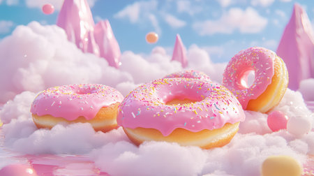 This imaginative stock photo features delicious donuts with pink icing and sprinkles resting on fluffy clouds, set against a whimsical landscape.