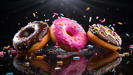 Donuts flying in the air with sprinkles and confetti. Generative AI.