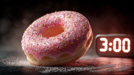 Delicious pink frosted donut with sprinkles on a matching pink background promotes sugar free and low sugar lifestyle choices. Highlighting the importance of reducing sugar intake for health benefits