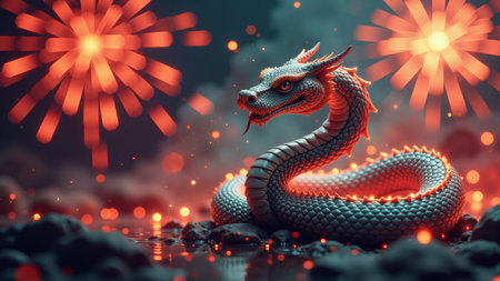 Chinese dragon flying in the sky with fireworks. 3D illustration.