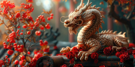 A golden dragon statue stands majestically in front of a traditional Chinese temple. The intricate details of the dragon's scales and claws are visible, as is the temple's ornate roof and colorful decorations. The statue symbolizes power, wisdom, and good fortune in Chinese culture.