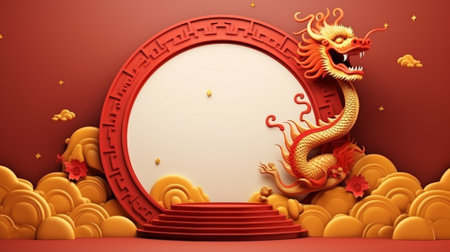 Golden Chinese dragon emblem displayed on a bold red background, symbolizing power, prosperity, tradition, and cultural celebration. Ideal for festive and Asian themed designs.