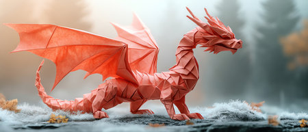 A majestic dragon statue, with its golden scales and red flames, stands proudly on a cliff overlooking the serene ocean. The mythical creature appears to be guarding the coastline, its powerful presence commanding attention.