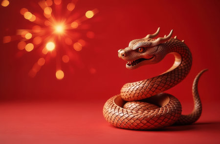 Golden snake celebrating chinese new year on red background. concept of zodiac sign, prosperity, traditional festivities. Copy space.