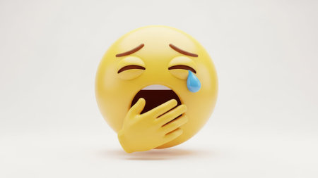 This image features a 3D-rendered crying face emoji isolated on a transparent background. The emoji has a yellow face, closed eyes, and a tear falling from one eye. It is covering its mouth with one hand, conveying a sense of sadness or distress. The background is white, making the emoji the focal point of the image. This image is ideal for use in digital design, social media, and online communication.