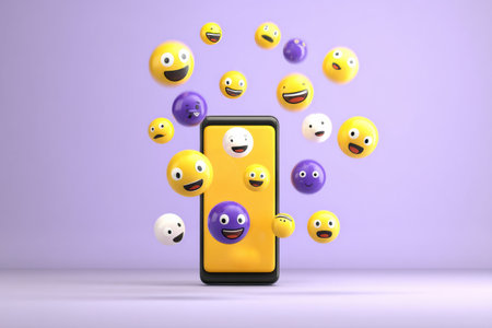 Colorful 3D emoji icons emerge from a smartphone screen, creating a lively and playful atmosphere with a soft purple backdrop.