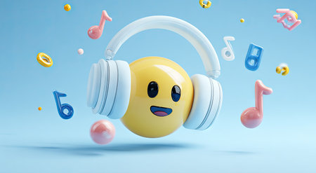 An illustrated yellow emoji wears white headphones surrounded by musical notes. The composition employs a cheerful, cartoon style with vibrant colors and soft lighting. This digital artwork may be suitable for creative projects, advertising campaigns, or design applications. It offers a playful visual to represent music and audio-related themes.