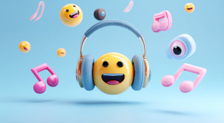 An image features a yellow emoji wearing headphones surrounded by music notes and other elements. The composition showcases bright colors and a playful style against a light blue backdrop. Suitable for various projects including advertising, social media content, and design applications. It has a cheerful aesthetic.