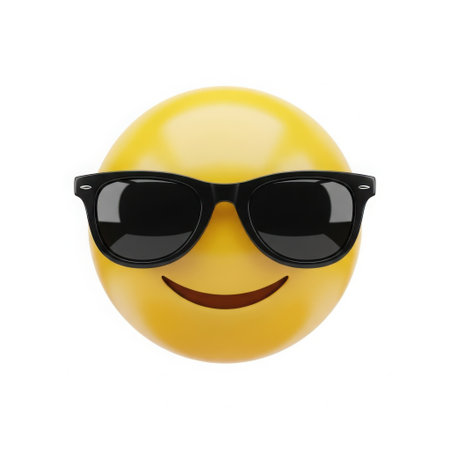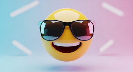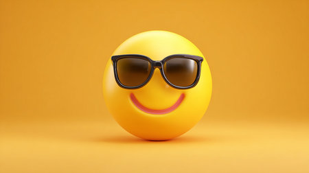 A bright yellow emoji with a happy smile wears stylish black sunglasses, conveying a sense of coolness and fun.
