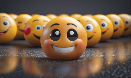 A row of smiling emoticons with rosy cheeks sits on a gray surface, radiating positivity