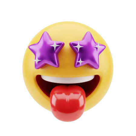 A cheerful, stylized emoji with a wide grin, sparkling star-shaped eyes, and its tongue playfully extended.