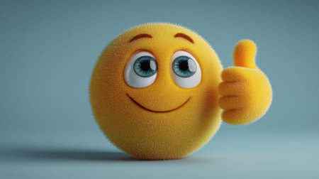Smiling fuzzy yellow emoji with thumbs up on blue background.